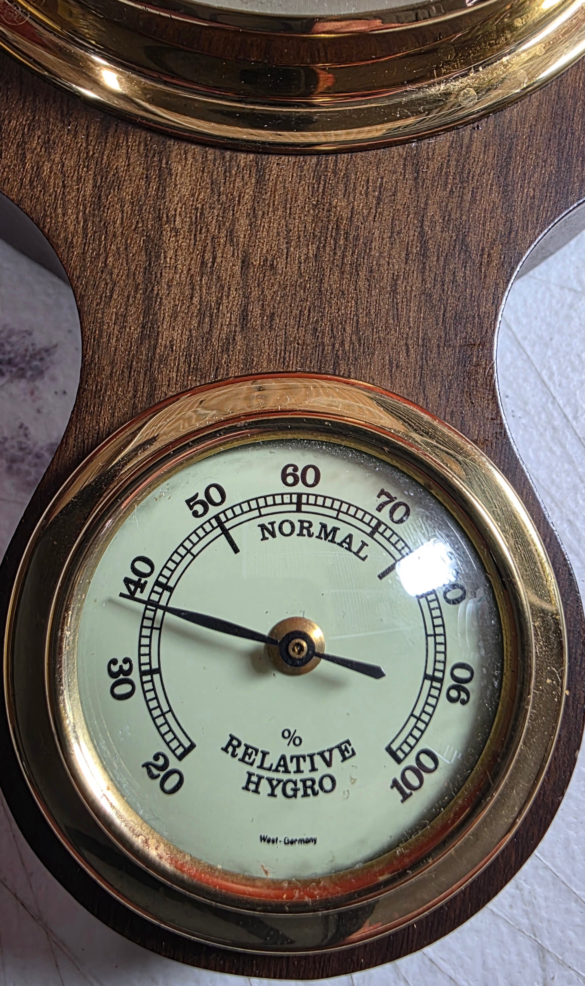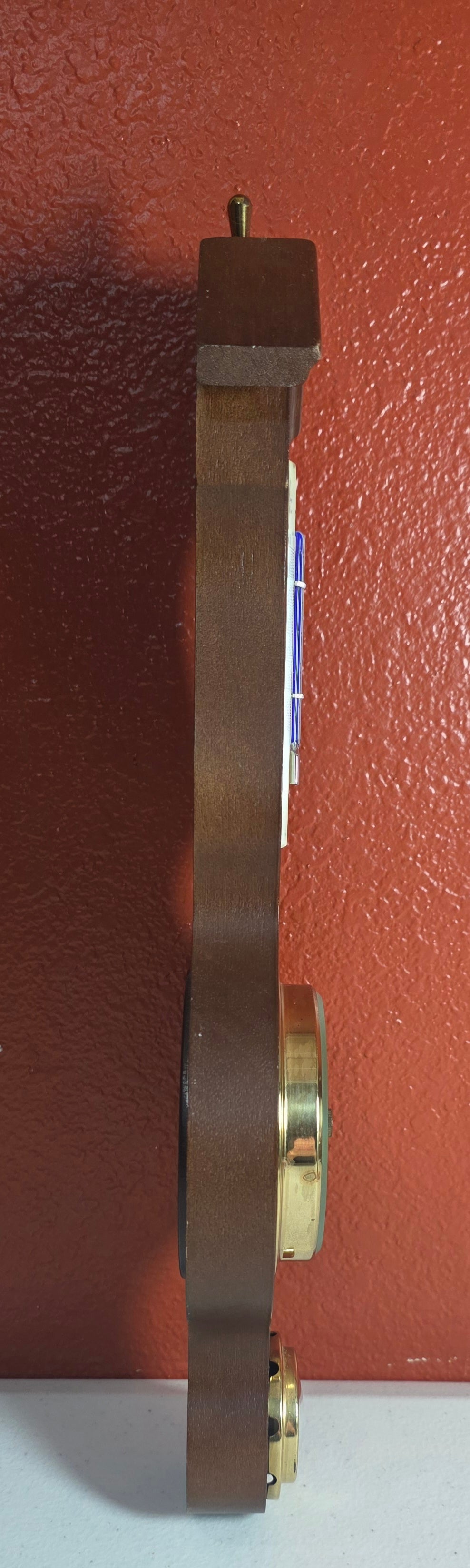 This is a banjo-style analog weather station made of walnut wood. It measures several atmospheric conditions: