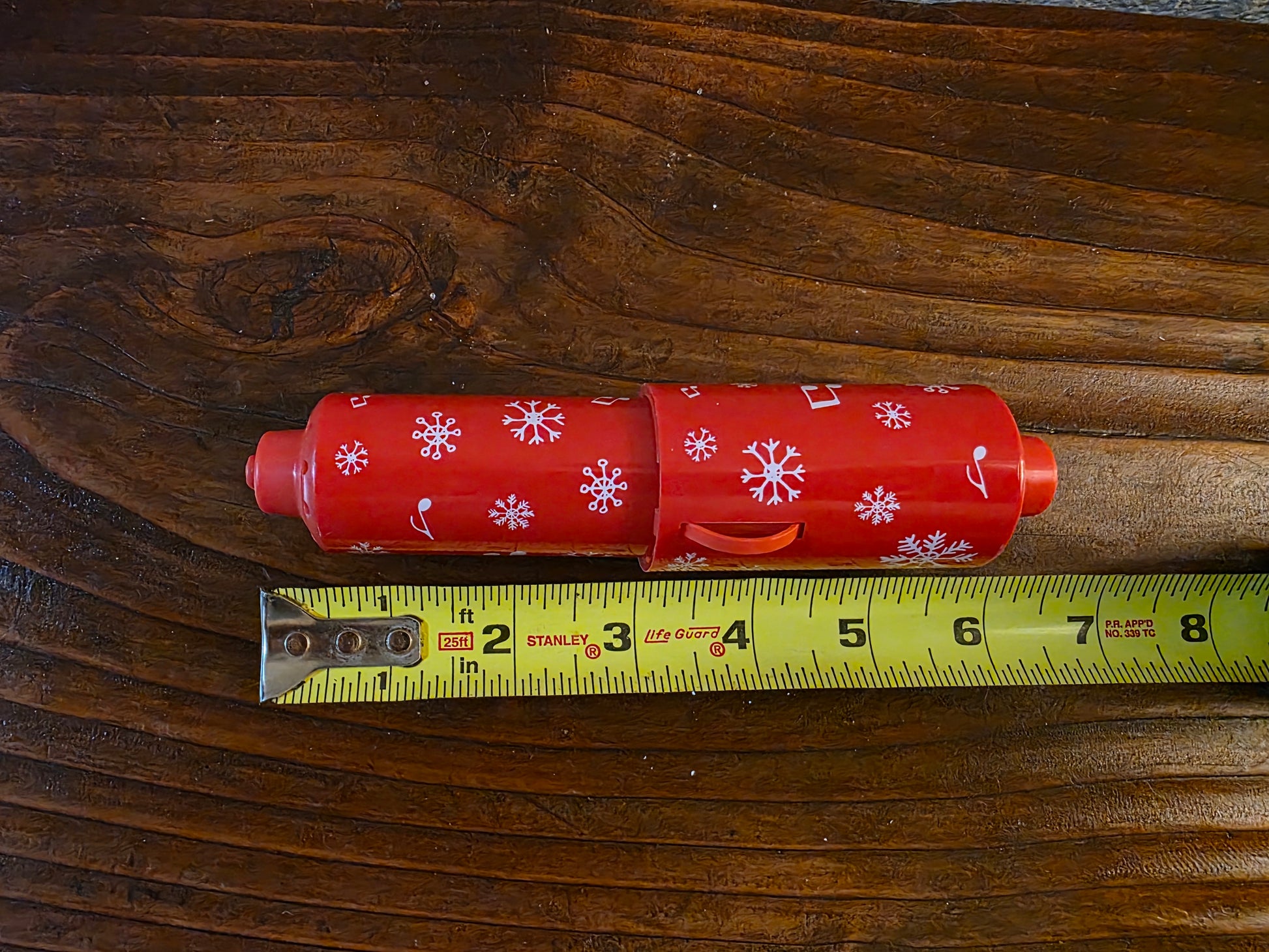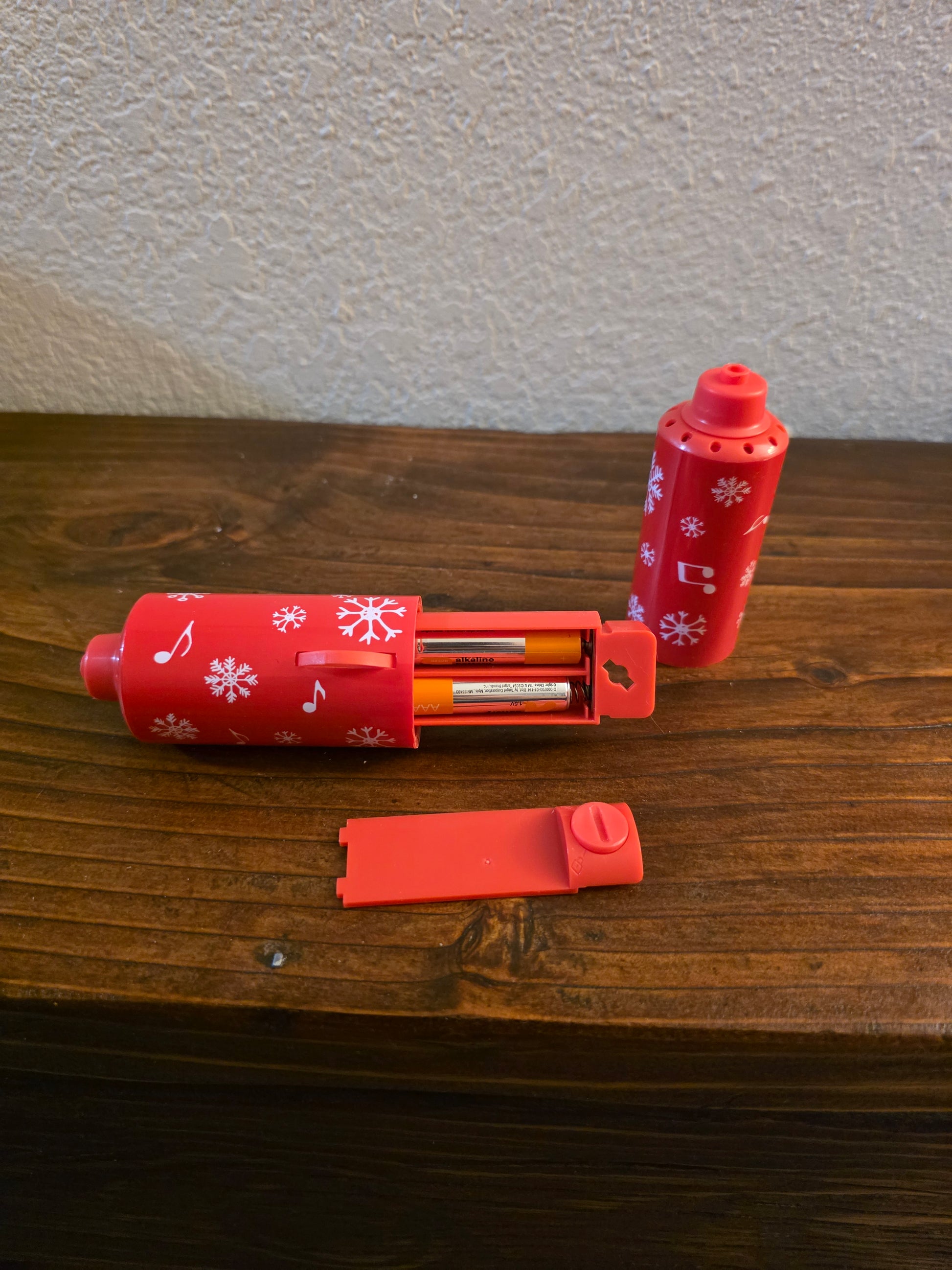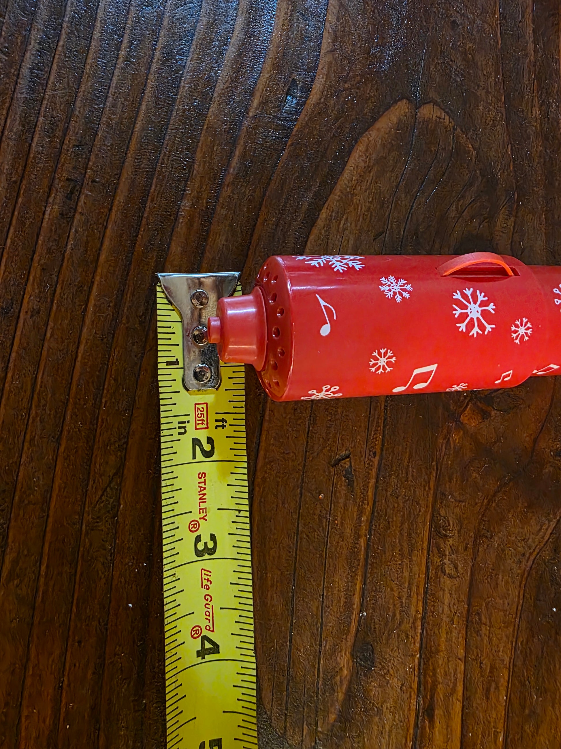The holder features a festive red design with white snowflakes and musical notes.